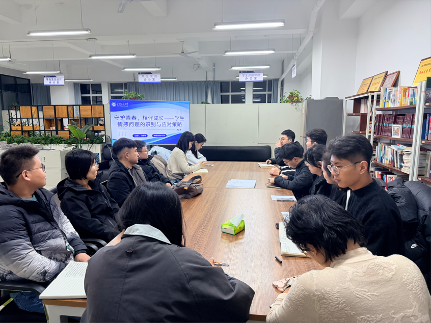 为进一步提升辅导员队伍的专业素养与工作能力,更好地守护学生健康成长,2025年11月21日晚19:30,学生工作部于鄠邑校区开物楼117举办了以“守护青春,相伴成长——学生情感问题的识别与应对策略”为主题的辅导员交流研讨沙龙。本次沙龙邀请地球科学与工程学院辅导员刘学斌担任主讲人,活动由学生工作部学生心理成长指导中心主任焦文洁主持,学生工作部副部长毕轶慧及院(系)辅导员代表参会。