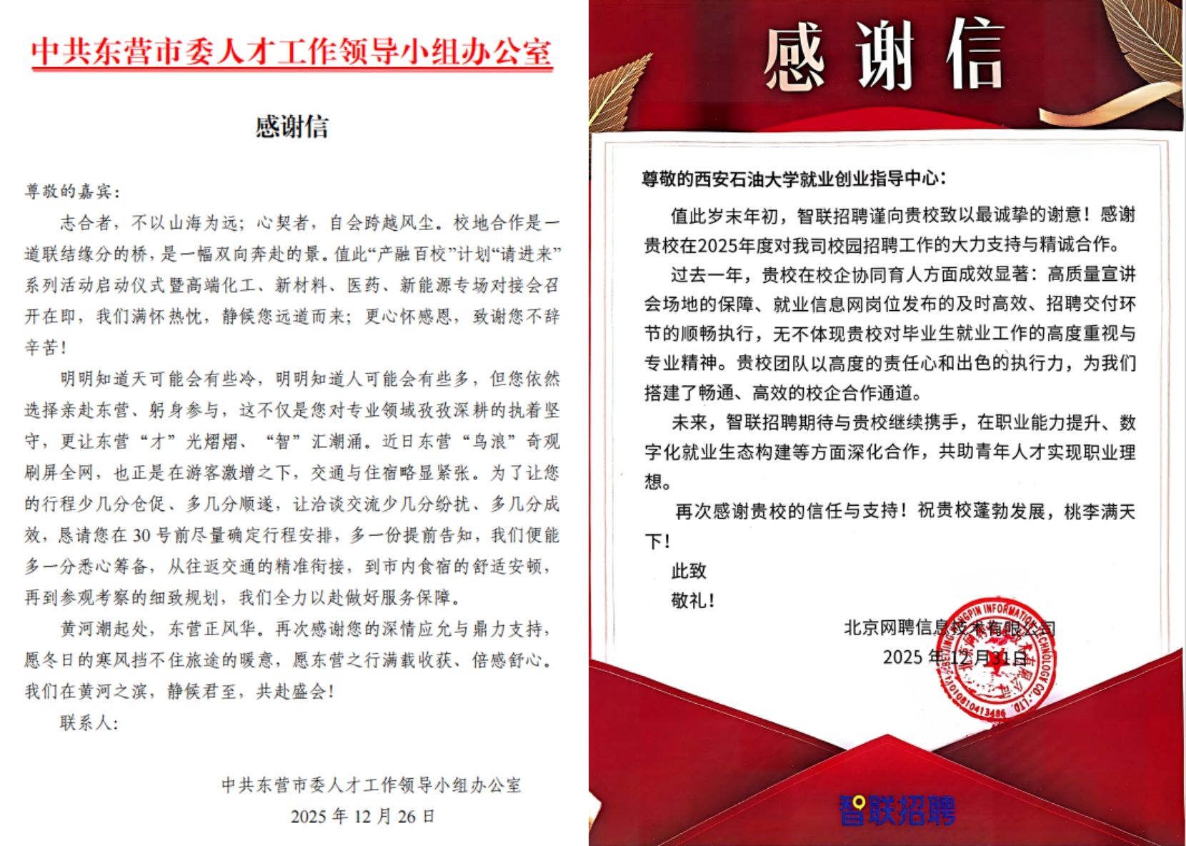 近日,我校就业创业指导中心陆续收到来自多地政府人社部门及用人单位的感谢信。字里行间饱含着对我校人才培养质量的高度认可和对学校关于就业组织、指导服务等工作的高度赞许,希望校地、校企携手并进,续写人才供需对接新篇章。