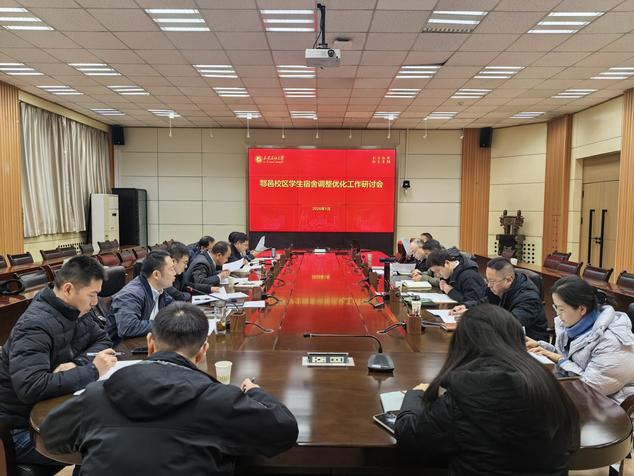 与会职能部门负责人围绕当前学生宿舍资源总体状况、新建两栋宿舍楼的容量与设施特点、在校生住宿分布、2026级新生预计规模与住宿需求预测等基础数据进行了详细汇报。同时,就本科生与研究生住宿资源的统筹调配、院(系)相对集中居住、住宿费标准的合规性与可持续性、国有资产的高效利用、后勤服务保障能力的同步提升等多个维度内容进行了讨论。